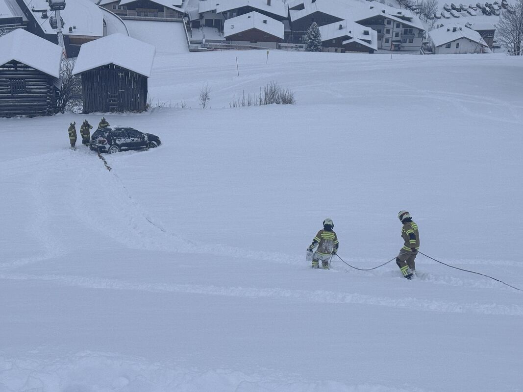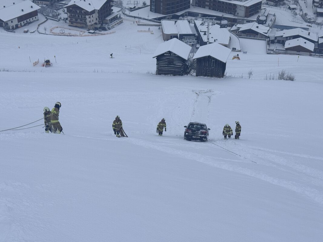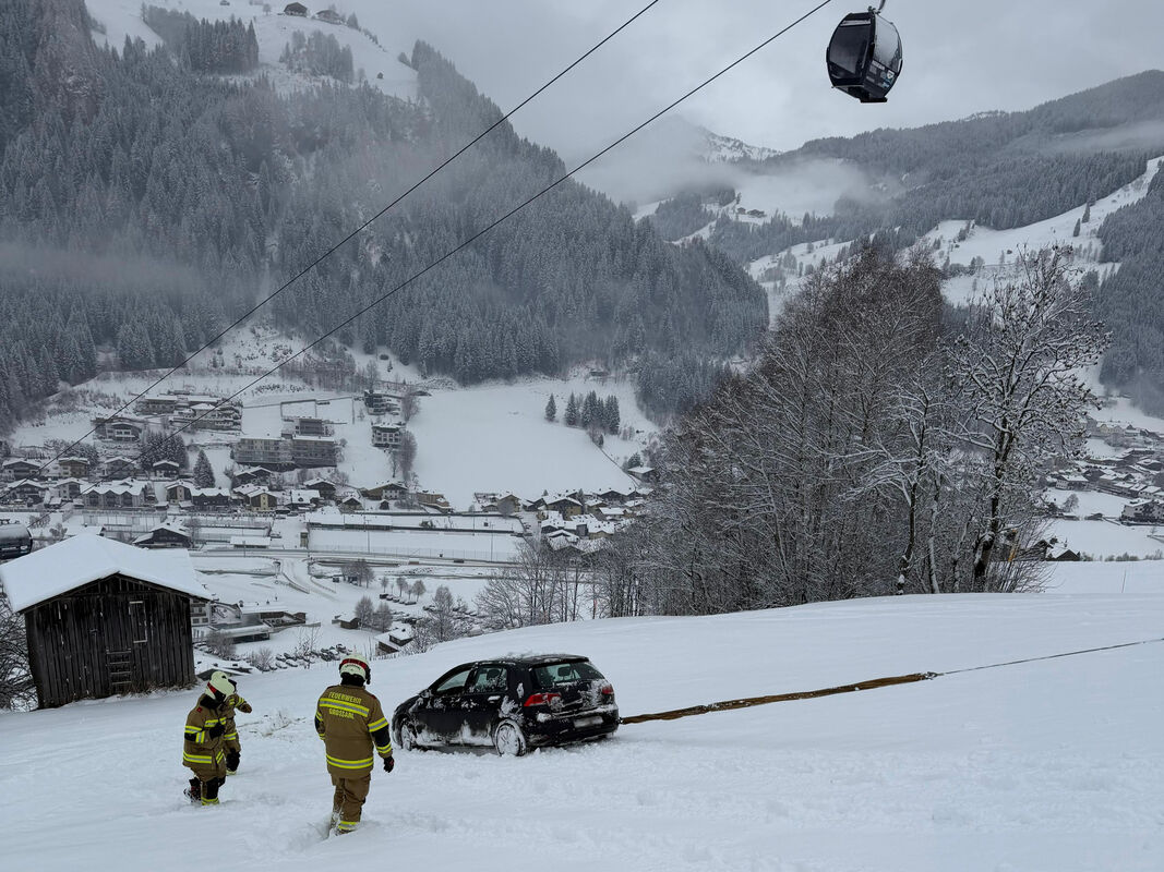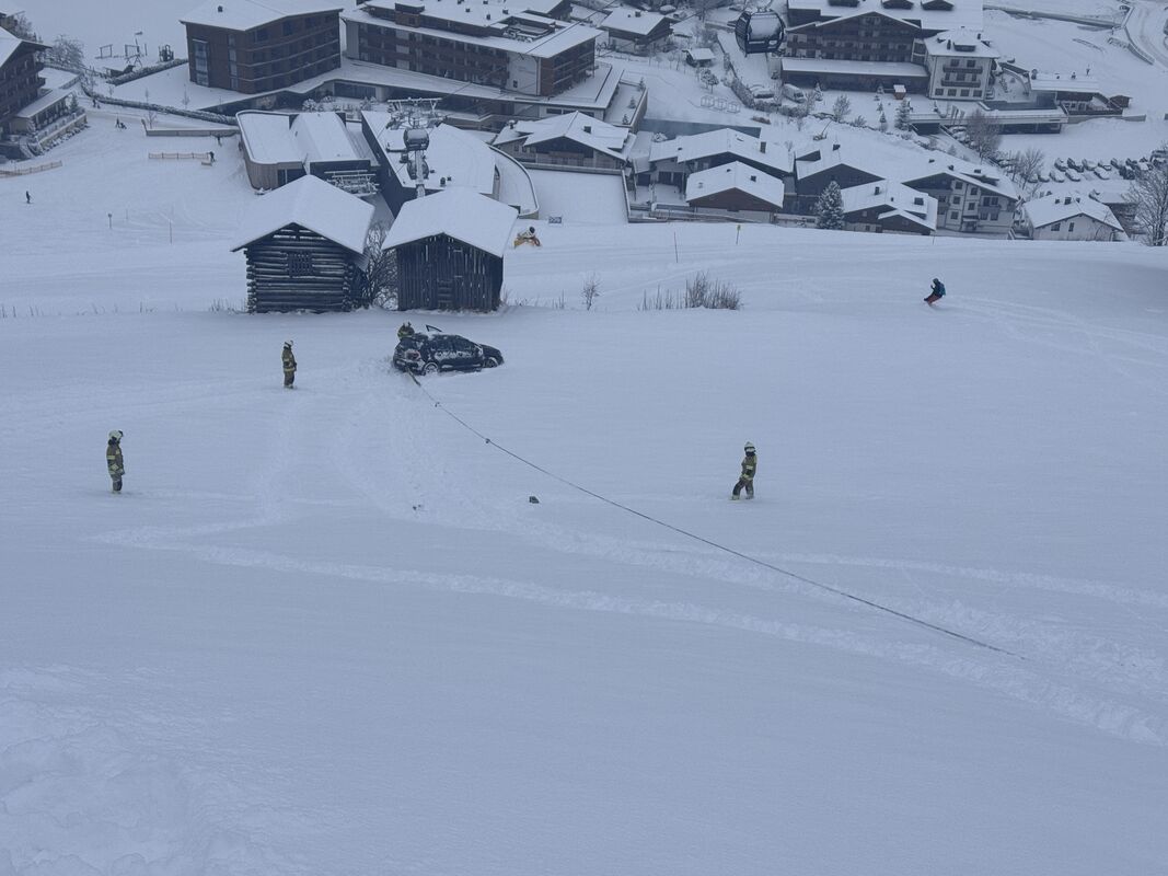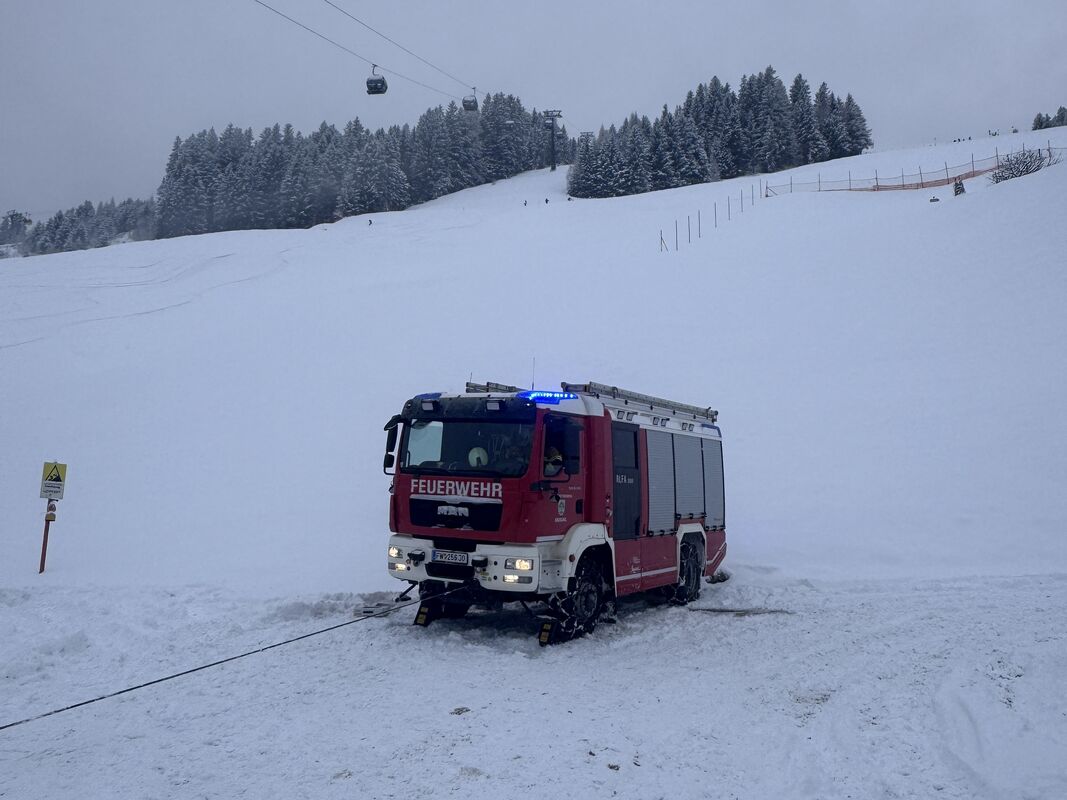 Kurz vor dem Einsatzende am Schiedweg erfolgte die Alarmierung zu einem weiteren Fahrzeugabsturz im Bereich „Rodelberg“. Ein PKW rutschte ca. 70 Meter über eine abschüssige Wiese unterhalb der Kieserlbahn. Auch hier konnte der Lenker das Fahrzeug eigenständig verlassen. Die Bergung erfolgte mit der Einbauseilwinde des Rüstlöschfahrzeugs.