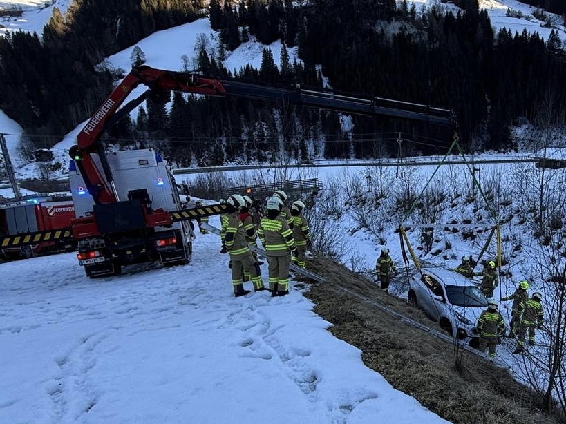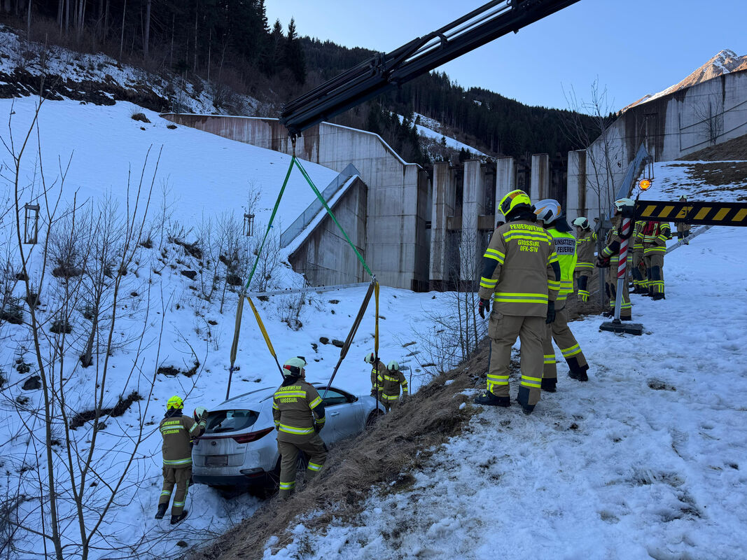 Ein PKW stürzte im Bereich der Wildbachsperre in den Schiedgraben. Mithilfe des schweren Rüstfahrzeugs (SRFA) der Feuerwehr St. Johann konnte das Fahrzeug geborgen werden.