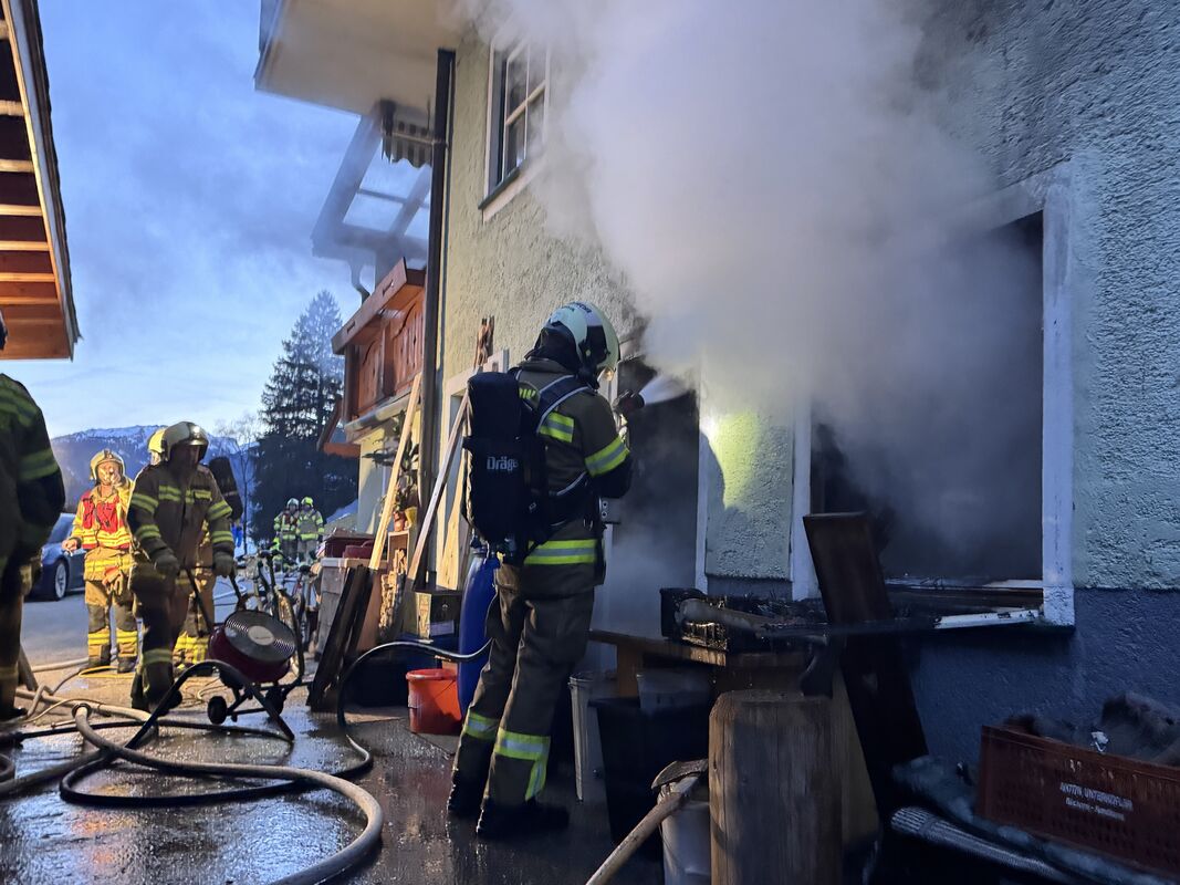 Vor Ort stellte sich heraus, dass sich der Brand im Keller bereits über die Treppe auf das Erdgeschoß ausgebreitet hatte und zwei Personen – eine davon nicht gehfähig – eingeschlossen waren. Ein Atemschutztrupp rückte umgehend zur Personenrettung in das Gebäude vor.